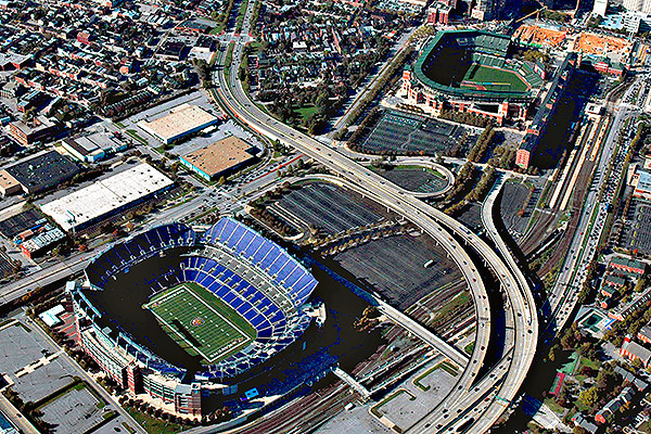 The crux of the problem is that the two teams share a parking lot due to the proximity of the two stadiums. Here’s a view of M&T Bank Stadium (Ravens) and Oriole Park at Camden Yards (Orioles):